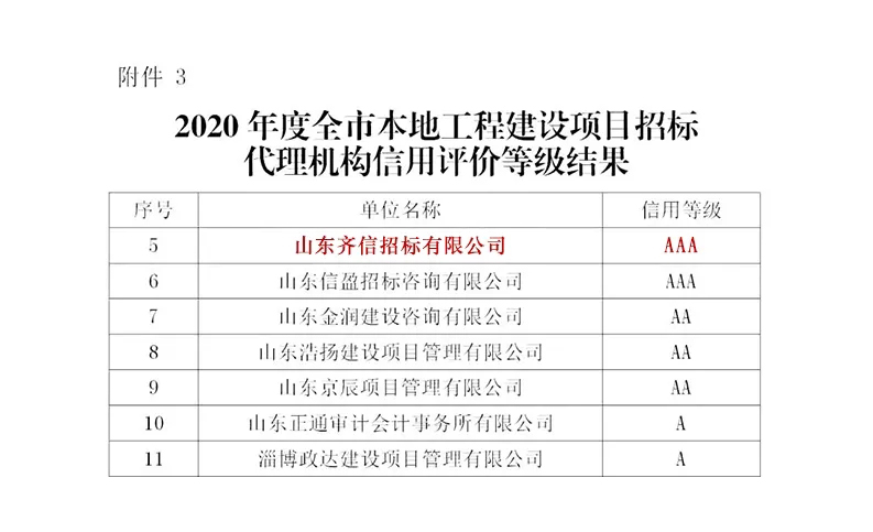 2021年5月,淄博市住建局發(fā)布《關(guān)于2020年度淄博市房地產(chǎn)開發(fā)企業(yè)等信用評價(jià)等級結(jié)果的通報(bào)》,齊信被評為淄博市工程建設(shè)項(xiàng)目招標(biāo)代理機(jī)構(gòu)AAA級信用企業(yè),列入行業(yè)誠信“紅名單”。