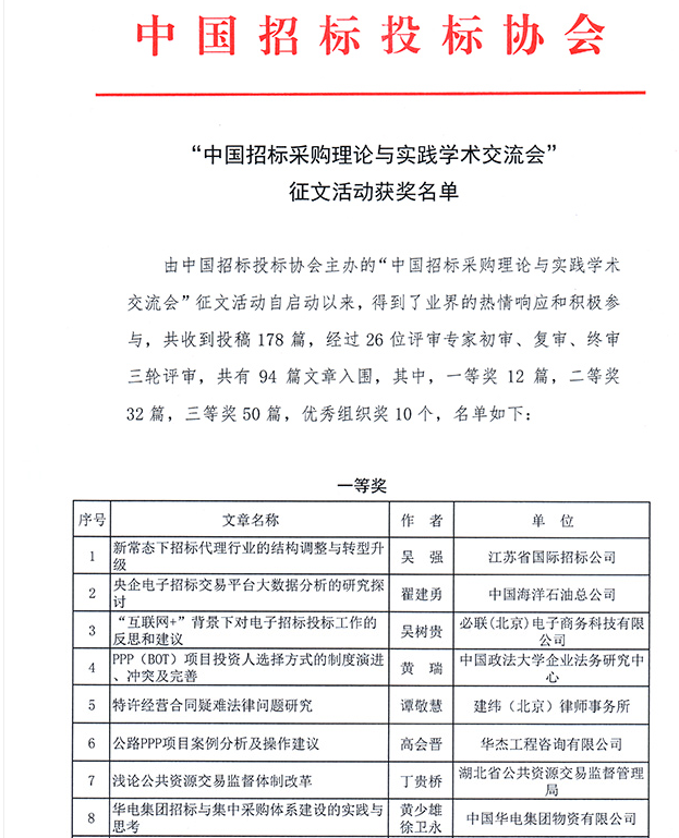 12月9日,由中國招投標協會主辦的“中國招標采購理論與實踐學術交流會”征文活動評獎揭曉,山東齊信招標有限公司獲優秀組織獎,公司濰坊政府項目招標事業部高偉九的論文“論新常態下招投標行業的 ‘不應變’與‘創新變’”喜獲三等獎。