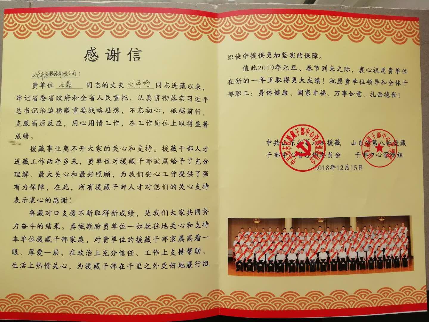2019年元旦來臨之際,公司收到一封來自中共山東省第八批援藏干部中心管理組委員會的感謝信,信中對咨詢服務事業(yè)部經(jīng)理石晶的丈夫劉軍河同志在魯藏對口支援工作中的辛勤付出給予高度評價與稱贊,對石晶及公司積極支持、關心援藏事業(yè)表達衷心的感謝,字里行間涌動著濃濃的情誼與祝福。